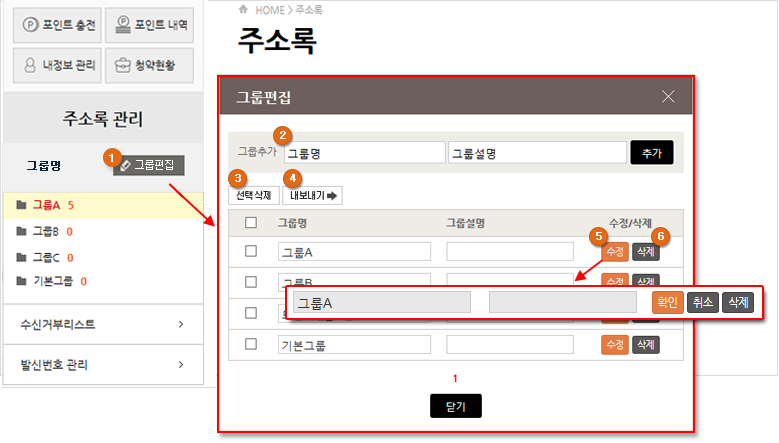 : 그룹을 생성, 삭제, 수정할 수 있습니다. 그룹편집 버튼을 클릭하면 그룹편집 레이어창이 뜹니다.