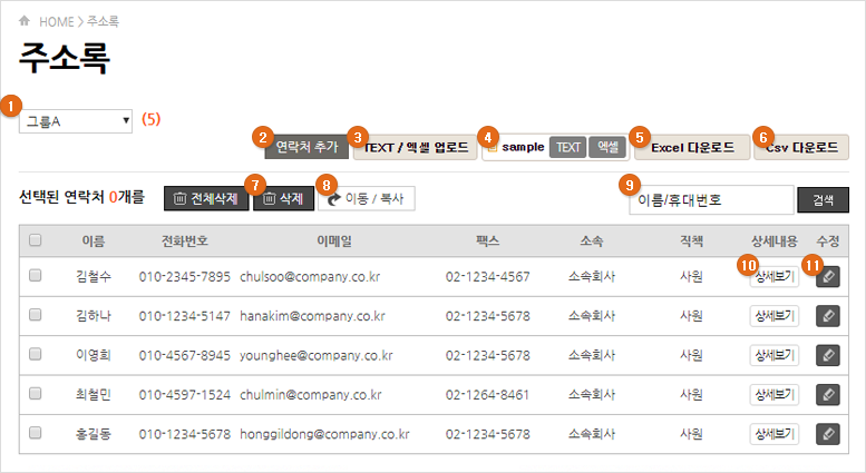 : 해당 그룹의 주소록을 엑셀 파일로 다운로드 받을 수 있습니다.