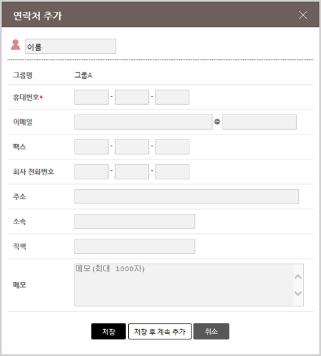 : 버튼을 클릭하면 아래와 같이 연락처 추가 새 창이 뜹니다. 휴대번호는 반드시 입력해야 합니다. 저장 후 계속 추가 버튼을 클릭하면 새 창이 닫기지 않고 연속적으로 추가작업을 할 수 있습니다.