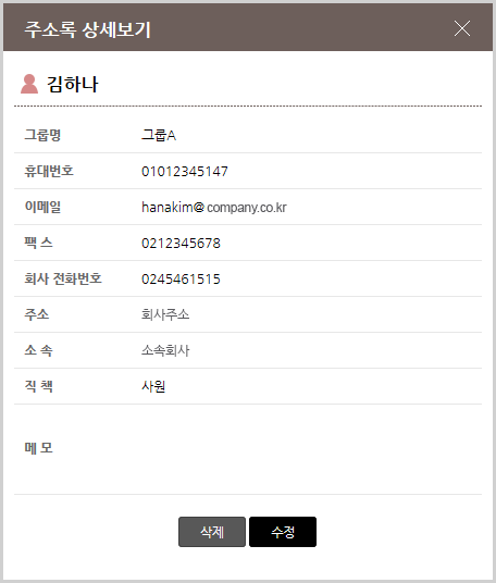 : 버튼을 클릭하면 새 창이 뜨며 해당 연락처의 내용을 상세하게 볼 수 있습니다. 새 창에서 삭제 버튼을 클릭하면 바로 삭제 되며 수정버튼은 내용을 바로 수정할 수 있습니다.