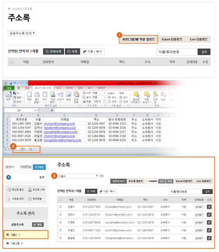: 시트(그룹)별 엑셀 업로드를 클릭해서 엑셀 시트를 업로드 하시면 엑셀 시트 이름으로 주소록 그룹이 생성되고 해당 주소록 그룹으로 주소록이 자동 등록됩니다.