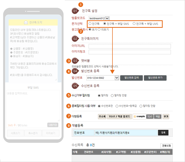 전화번호를 직접 입력하고 전화번호 외 여러 항목을 입력할 시 “|”로 항목을 구분하여 업로드 합니다